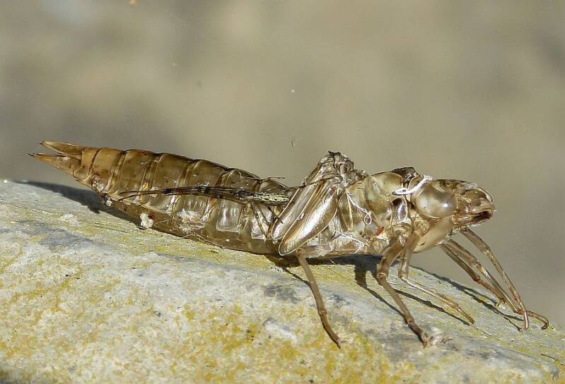 Opmerking: Foto's hieronder een detail en een Strekspin op een Larvenhuidje van de Grote keizerlibel. De spinnen leefde in de hoeken van de water reservoirs voor de bananenplantages