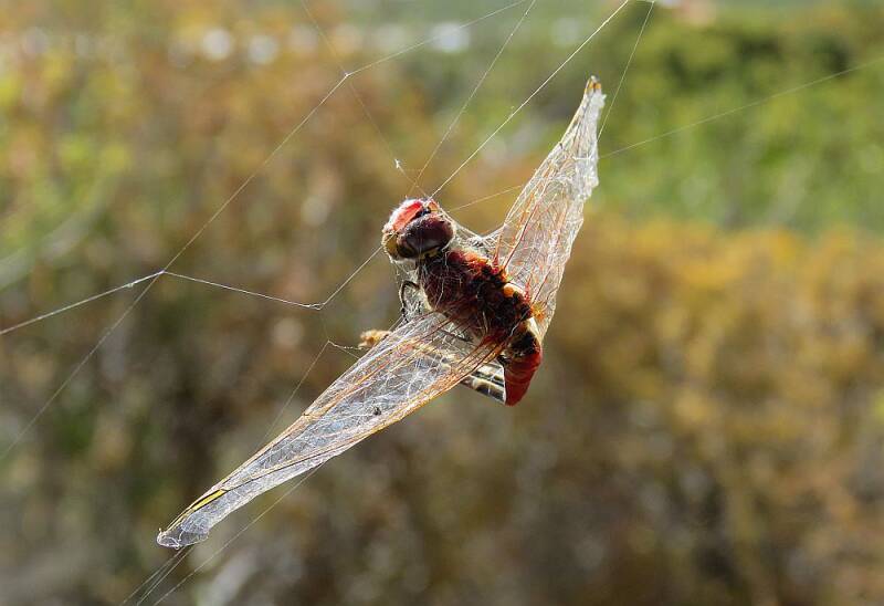 Nederlandse naam: Vuurlibel man gevangen in web van de Wespspin