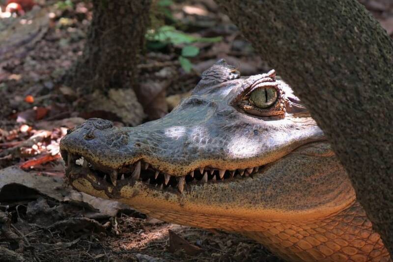 Nederlandse naam: BrilkaaimanWetenschappelijke naam: Caiman crocodilusEngelse naam: Spectacled caimanGefotografeerd: Nationaal Park Sierpe. Costa Rica maart 2013 (Storende tak op voorgrond met AI laten verwijderen)