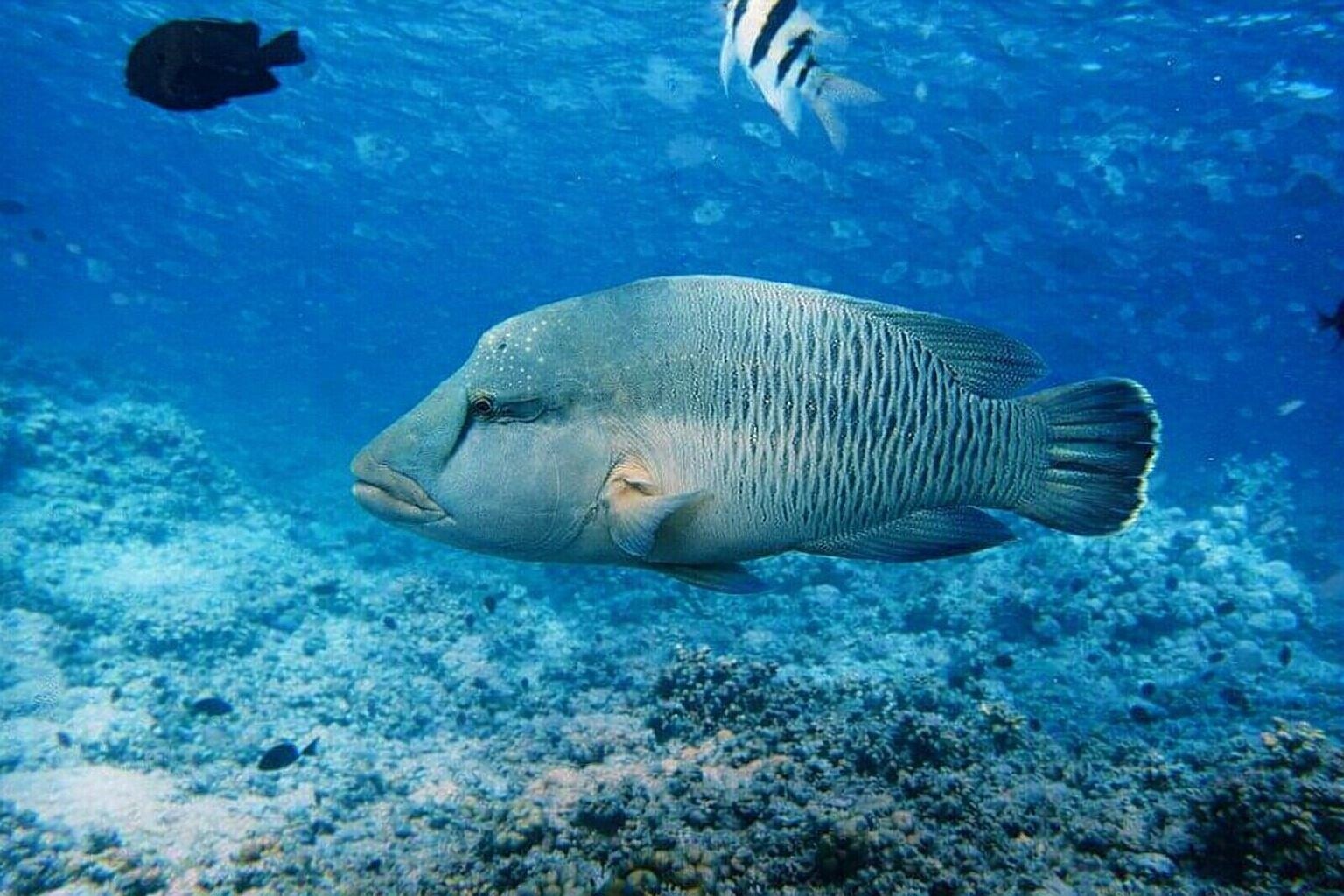 Nederlandse naam: NapoleonvisWetenschappelijke naam: Cheilinus undulatusEngelse naam: NapoleonfishGefotografeerd: Malediven Embudu 2000Opmerking: Foto is gemaakt met een eenvoudige wegwerp onderwatercamera