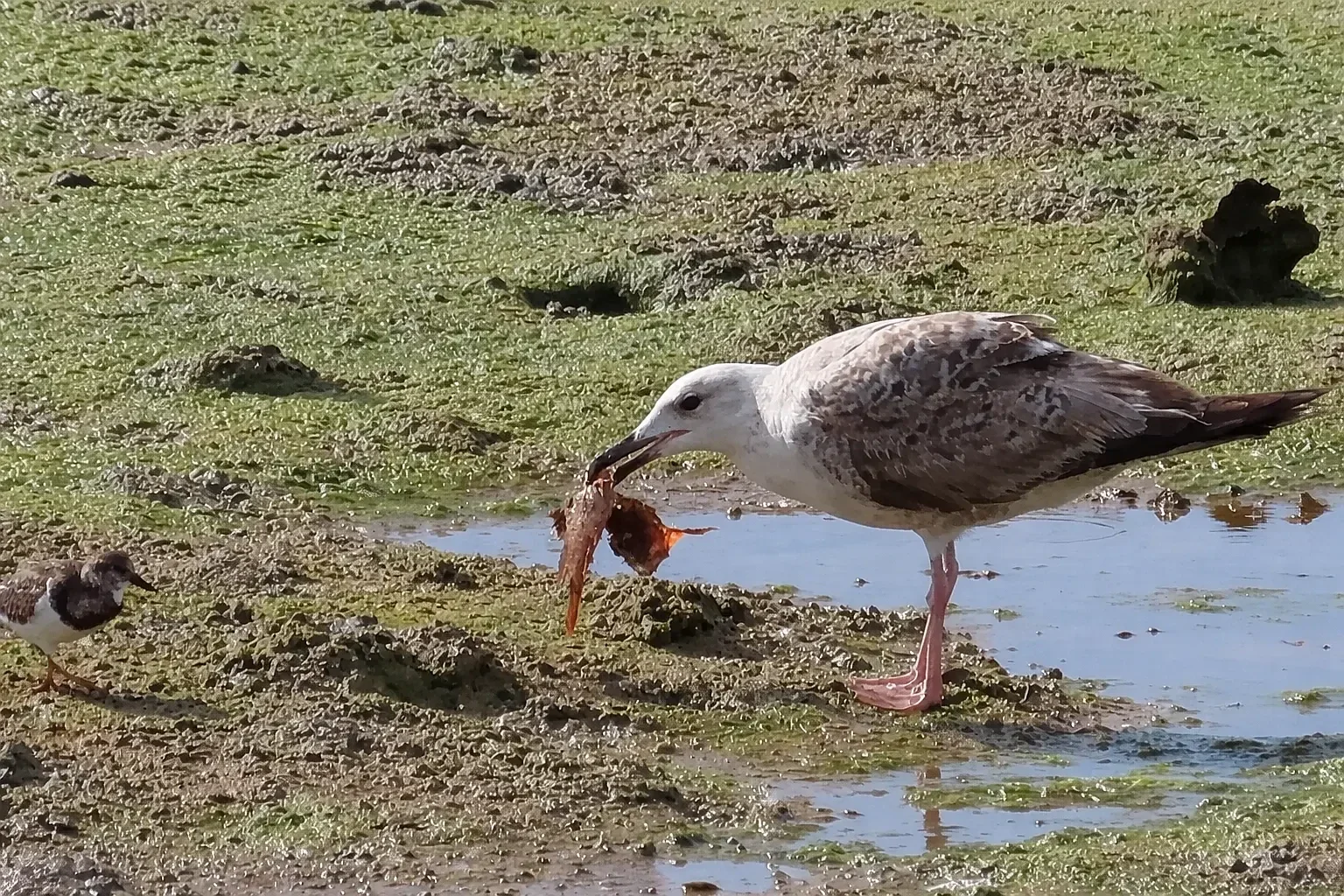 Opmerking: Meeuw demonteert wenkkrab en steenloper hoopt graantje mee te pikken