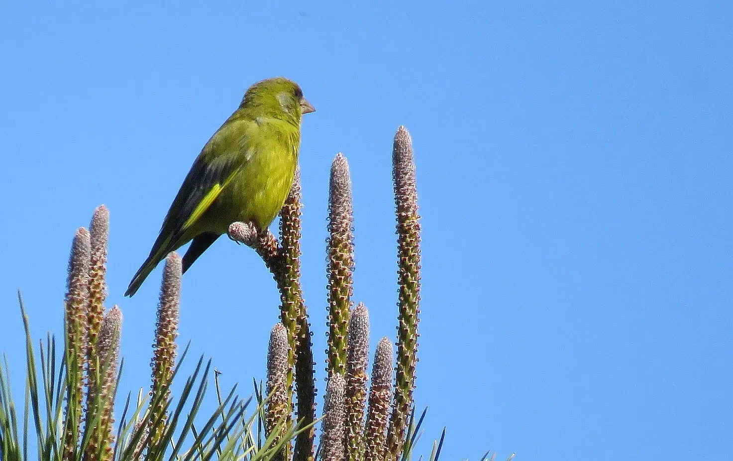 Nederlandse naam: Groenling manLatijnse naam: Chloris chlorisEngelse naam: European greenfinchGefotografeerd: Portugal Manta Rota 24-03-2016