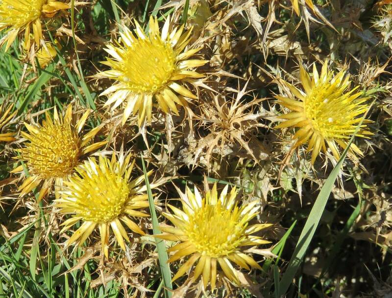 Nederlandse naam: CarlinaWetenschappelijke naam: Carlina corymbosaEngelse naam: Clustered carline thistleGefotografeerd: Spanje omgeving Benillup 03-11-2018