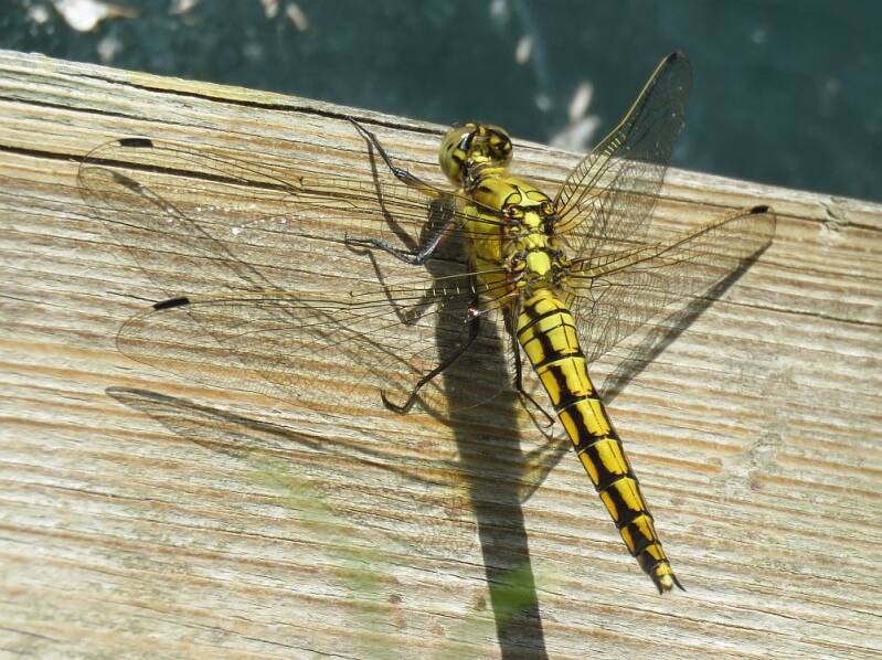 De eerste bezoeker die is vast gelegd was op 17-07-2015. Een Heidelibel. Omdat de poten gele strepen heeft komen de Steenrode of Bruinrode heidelibel in aanmerking, maar kun je pas met zekerheid zeggen als je hem frontaal kan bekijken of hij een snor heeft.