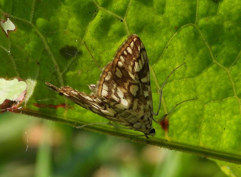 Nederlandse naam: WaterleliemotWetenschappelijke naam: Elophila nymphaeataEngelse naam: Brown China MarkGefotografeerd: Polder Ackerdijk bij Overslagpad 04-06-2023Opmerking: Zat aan de onderkant van een blad