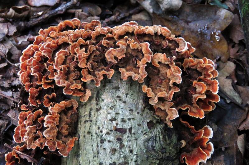 Nederlandse naam: EikenbloedzwamWetenschappelijke naam: Stereum gausapatumEngelse naam: -Gefotografeerd: Delftse Hout 02-02-2015
