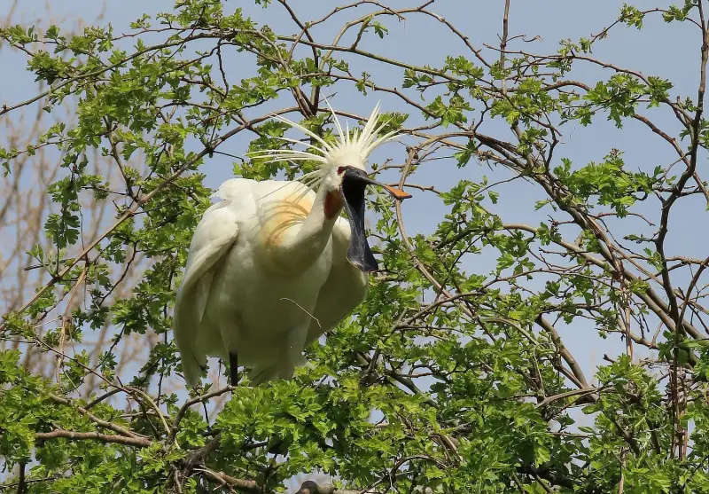 Twee net aangekomen lepelaars uit de Delftse broedkolonie stonden bij te komen van hun lange reis vanuit het zuiden.
