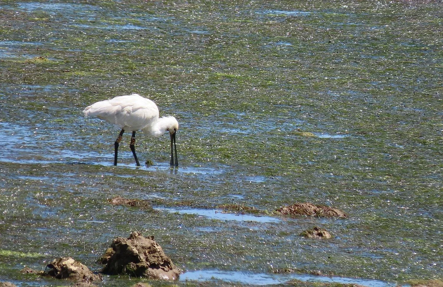 09-04-2022 Cabanas de Tavira Dubbel geringde Lepelaar aan het foerageren