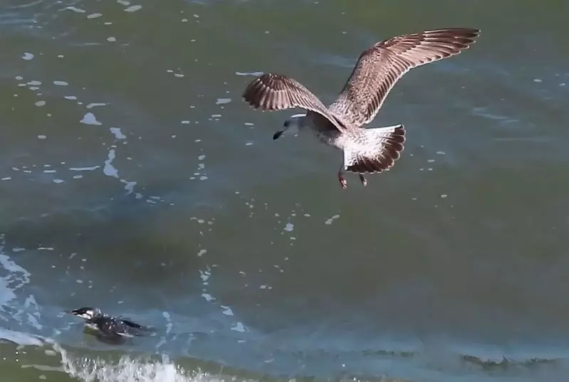 Zilvermeeuw probeert mogelijke buit van de Zeekoet af te pakken. Zie video
