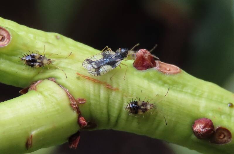 Nederlandse naam: NetwantsWetenschappelijke naam: Stephanitis takeyaiGefotografeerd: Delft achtertuin 05-10-2022Opmerking: Op de Pyrusstruik (Helaas ten dode opgeschreven)